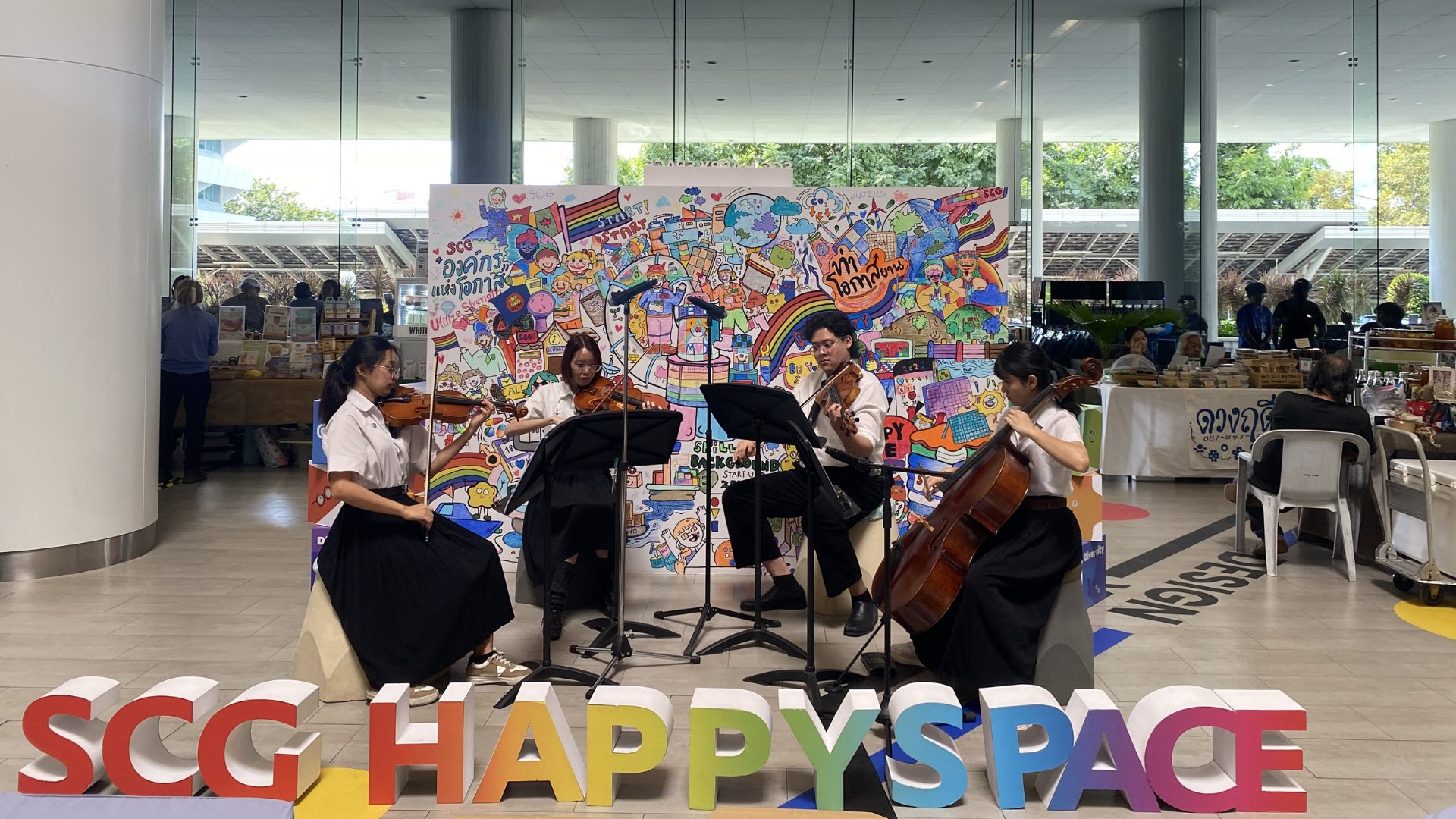 Princess Galyani Vadhana Institute of Music (PGVIM) continues to advance its mission of Academic Service to Society by deploying a group of student representatives to perform classical music in a string quartet formation as part of the event “SCG Happy Sati Space (Gift Give Fest).”