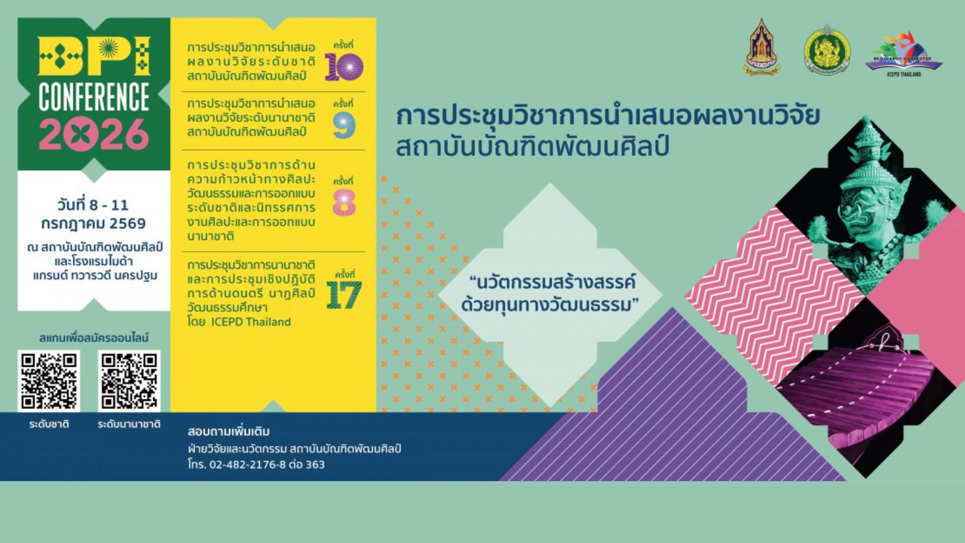 สถาบันบัณฑิตพัฒนศิลป์ ขอเรียนเชิญผู้ที่สนใจ ส่งบทความ และเข้าร่วม การประชุมวิชาการนำเสนอผลงานวิจัย ประจำปี 2569 (BPI CONFERENCE 2026)